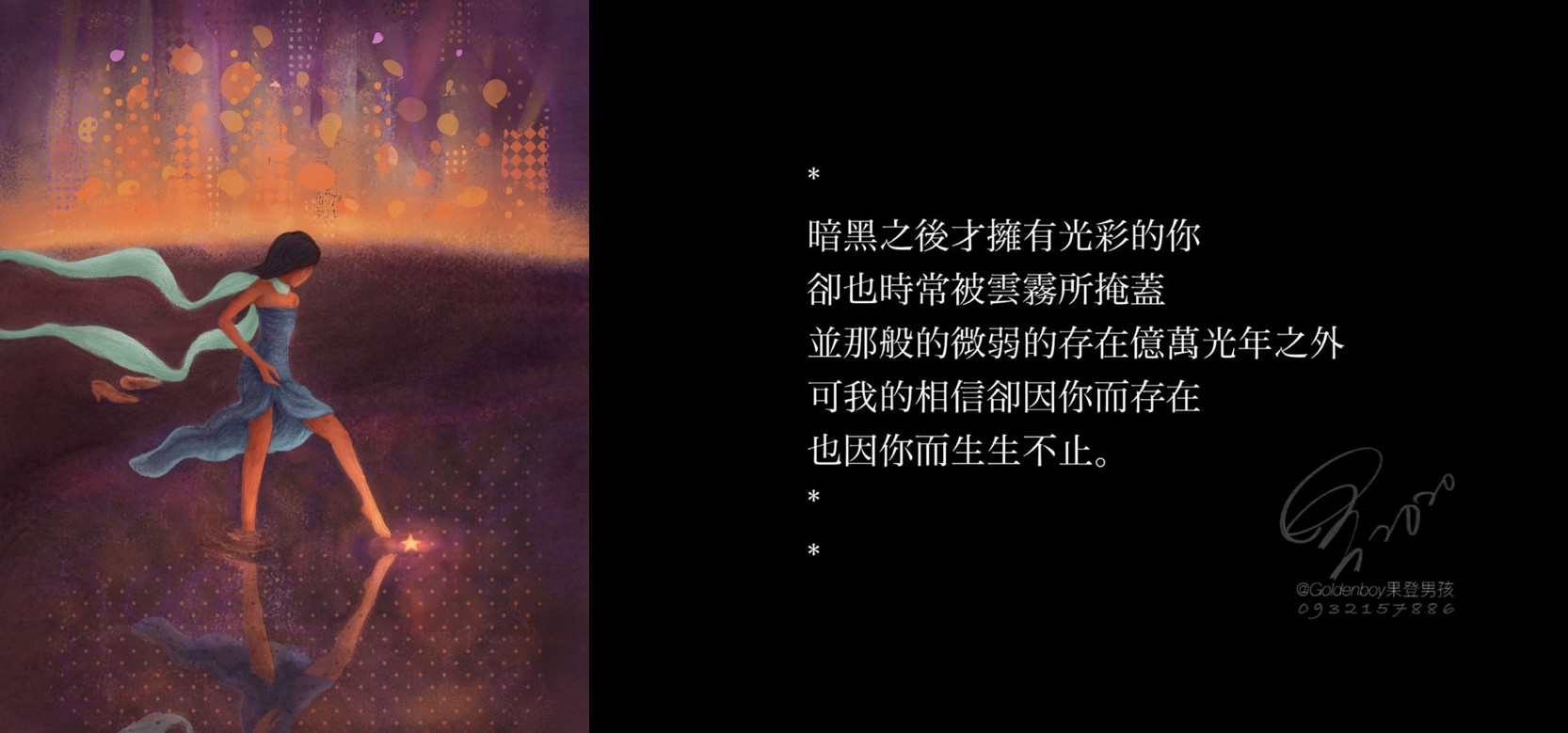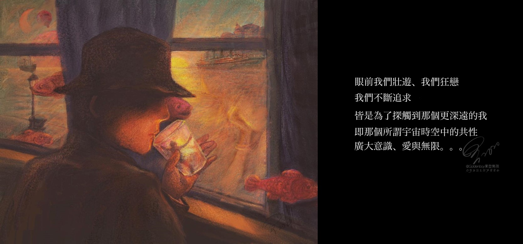 果登男孩,在多元的時空中探索建立起未來的想像世界,在無止盡的夢想追逐中感受到源源不絕的愛意,每一幅作品都是老師由感而發,在漫漫時空旅途中呈現每個時間遇到的人事物,用一支畫筆畫出最深刻的感受。